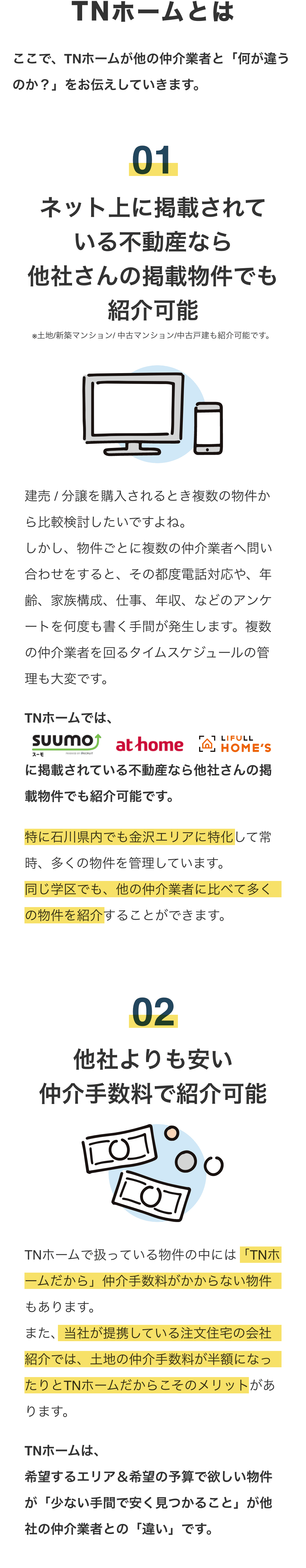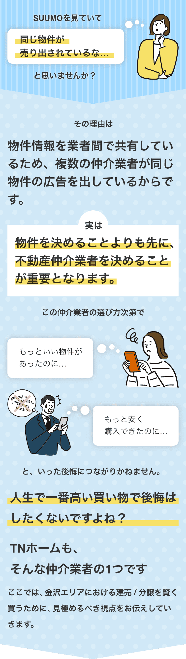 お客様の声 最後に このように建売 / 分譲を購入検討されている方はできるだけ安く・満足いく形で購入ができる不動産仲介業者選びが大事になってきます。 石川県、特に金沢エリアで新築や土地購入を検討している方はぜひ一度TNホームのホームページをご覧になってみてください。